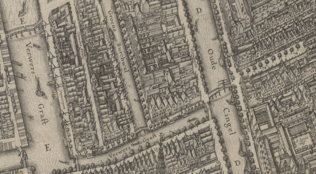 In de Verversstraat, aan de oostelijke zijde van de stad, hield Margriet Clement van Tournai (1591/2 – tussen 1660/1667) haar gasterij. Zij was als meisje naar Amsterdam gekomen, waar ze in 1610 op ongeveer achttienjarige leeftijd voor het eerst trouwde, met een weduwnaar die eveneens uit Tournai kwam. Na diens overlijden hertrouwde ze wederom met een man uit Tournai, waarna ze in 1632 hertrouwde met weduwnaar en spijkermaker Lourens Martijn. Inmiddels had ze in haar drie huwelijken acht kinderen ter wereld gebracht, die allemaal in de Oude Waalse Kerk werden gedoopt.29Omstreeks 1638, toen haar man Lourens voor enkele jaren naar Brazilië vertrok, begon zij haar gasterij.30 Met een echtgenoot die voor langere tijd buitengaats was en haar oudste kinderen die vermoedelijk niet (allemaal) meer thuis woonden, leende haar huis zich om slapers onder te brengen. Mogelijk hebben haar nog inwonende dochters geholpen met de dagelijkse werkzaamheden in de gasterij. Margriet richtte zich, zo blijkt uit de transportakten, vooral op Frans(talig)e militairen: van de 34 mannen die hun gage op Clement transporteerden, kwamen er slechts drie – twee Friezen en een Leidenaar – niet uit Franstalige gebieden. Gezien de afkomst van haar en haar partners en haar betrokkenheid bij de Waalse gemeenschap was deze specialisatie begrijpelijk.